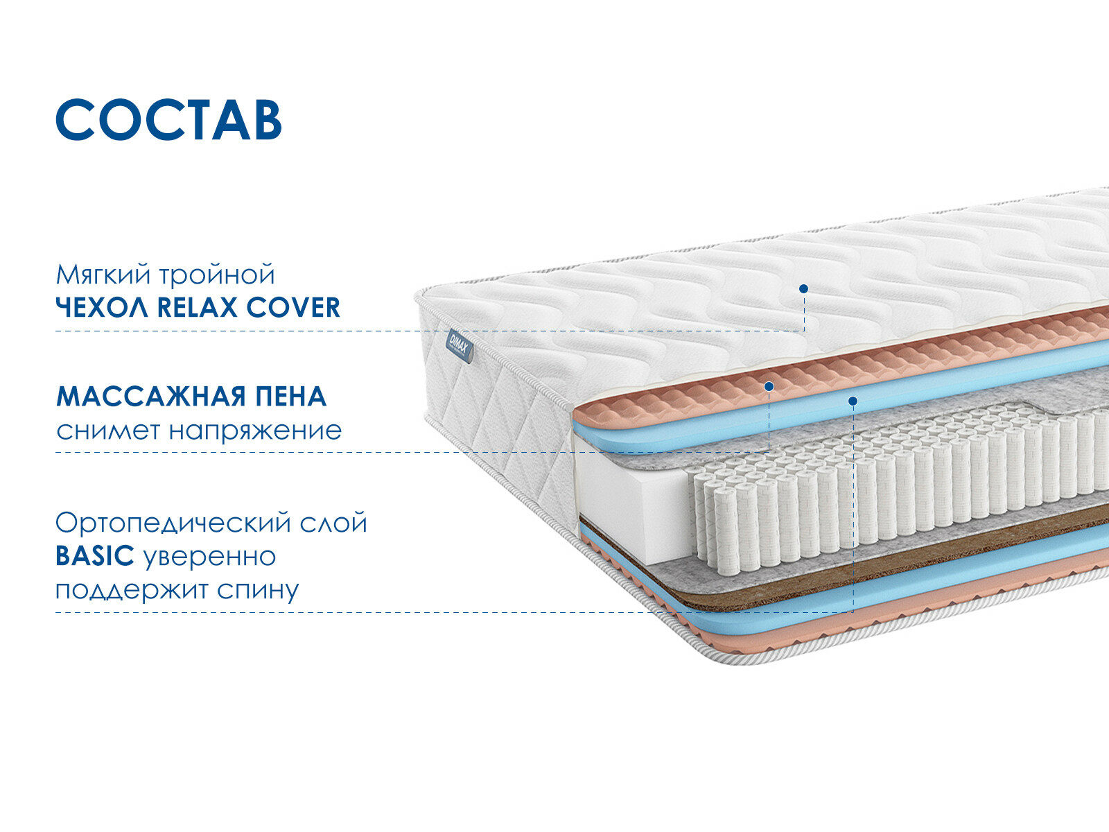 Димакс Relmas Various S1000 – двусторонний ортопедический матрас с разной жёсткостью сторон: средней и выше среднего. Модель сочетает в себе ортопедические свойства и массажный эффект, который помогает расслабить мышцы и улучшить кровообращение во время сна.