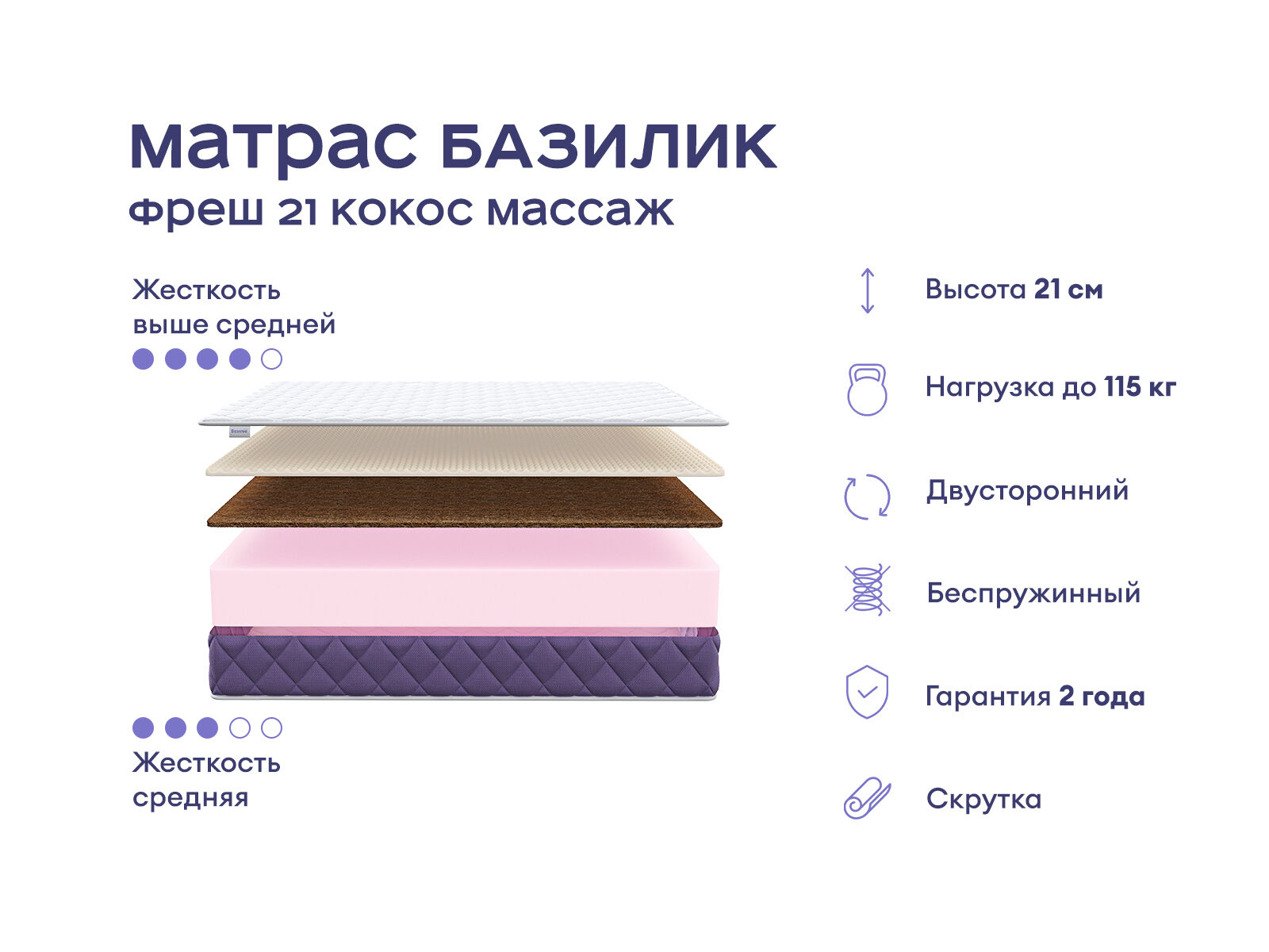 Беспружинный матрас с уникальной поддержкой и расслабляющим массажным эффектом. Двусторонняя конструкция с разной жёсткостью сторон делает модель отличным выбором для полноценного отдыха.