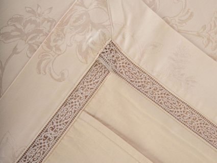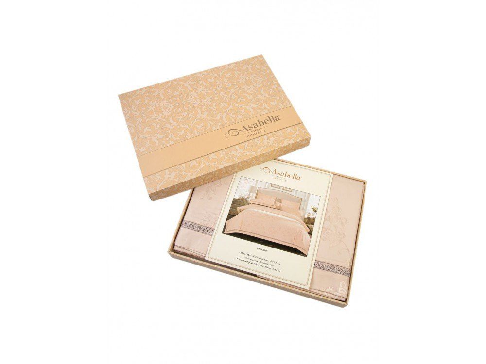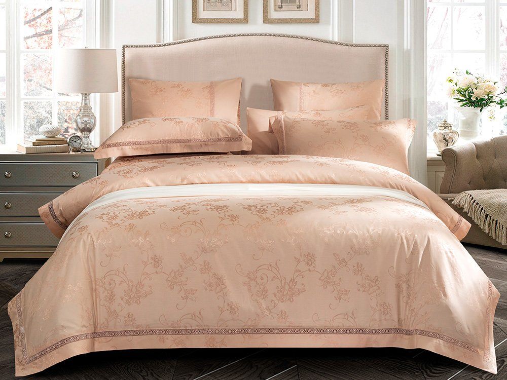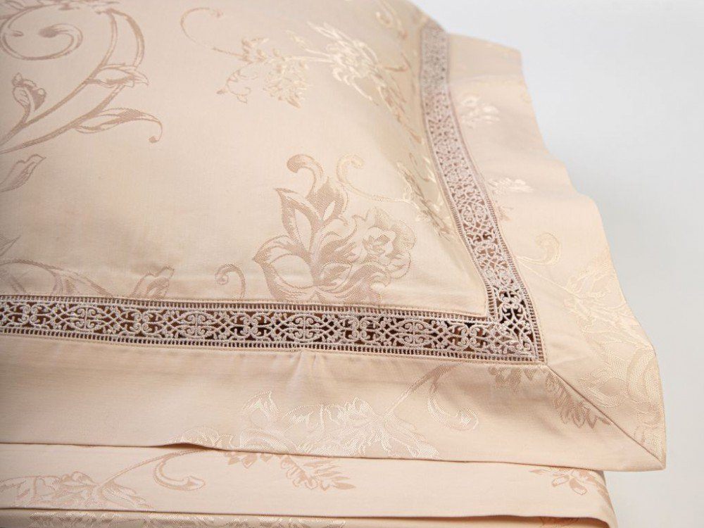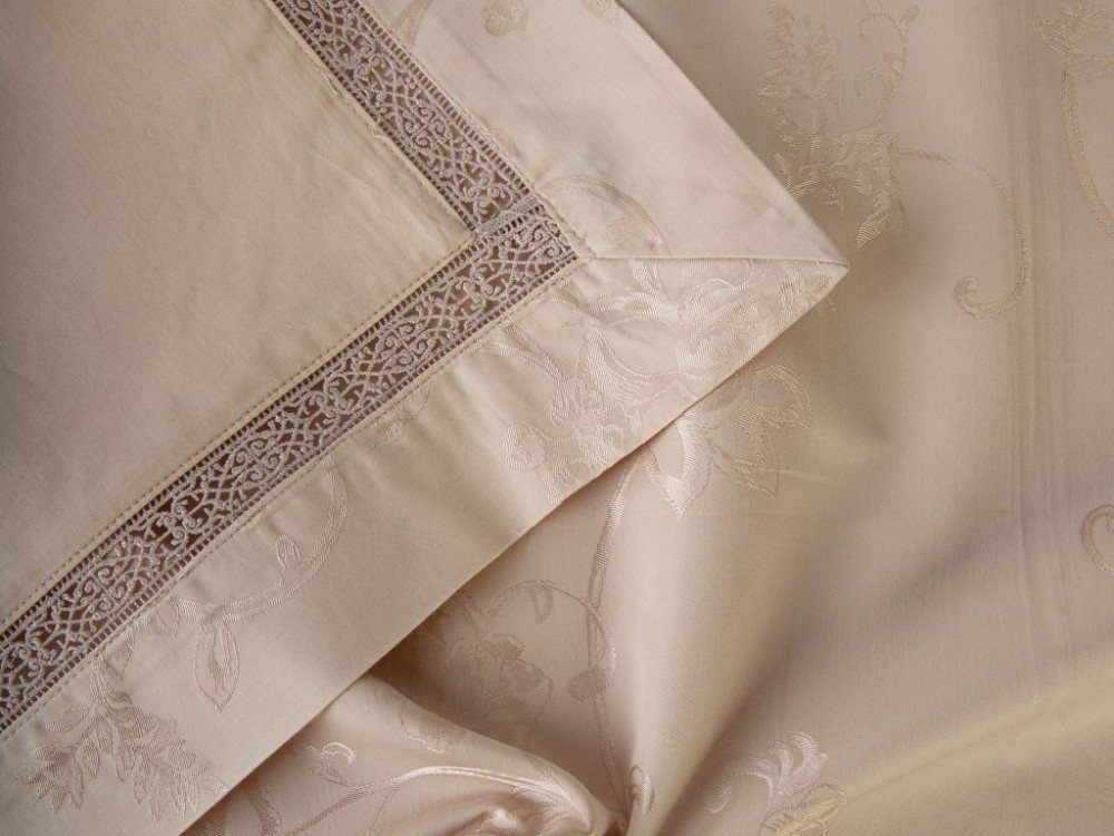 Верх пододеяльника и наволочек - жаккардовый люкс-сатин (55% вискоза, 45% хлопок). Оборотная сторона пододеяльника, наволочек и простыня - люкс-сатин (100% хлопок).