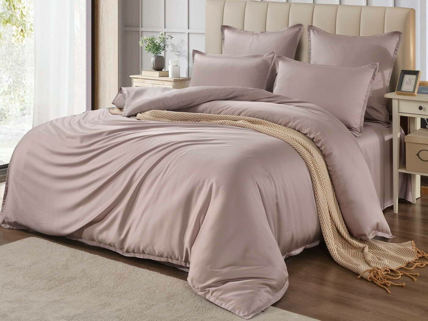 Комплекты постельного белья Ансель: нежность и комфорт каждую ночь Ищете постельное бельё, которое подарит вам незабываемый комфорт и уют? Тогда комплекты постельного белья Ансель из тенселя — идеальный выбор! Тенсель — это натуральная ткань, изготовленная из волокон эвкалипта. Она обладает рядом преимуществ перед хлопковыми тканями: более нежная, шелковистая и приятная на ощупь. Комплекты постельного белья Ансель включают в себя наволочки, простыню и пододеяльник. Они выполнены из 100% тенселя, что гарантирует высокое качество и долговечность. Одно из главных преимуществ тенселя — его способность пропускать воздух и хорошо впитывать и испарять влагу. Это обеспечивает оптимальный микроклимат во время сна, предотвращает появление неприятных запахов и бактерий. Ещё одно важное свойство тенселя — антибактериальный эффект. Это значит, что постельное бельё Ансель не вызывает аллергии и подходит для людей с чувствительной кожей. Уникальное свойство тенселя — климат-контроль. При высокой температуре в помещении ткань обладает лёгким и приятным охлаждающим эффектом, а при низкой создаёт ощущение тепла и комфорта. Комплекты постельного белья Ансель — это идеальный выбор для тех, кто ценит комфорт, качество и натуральность. Они станут отличным дополнением к вашему интерьеру и подарят вам незабываемые ощущения во время сна.