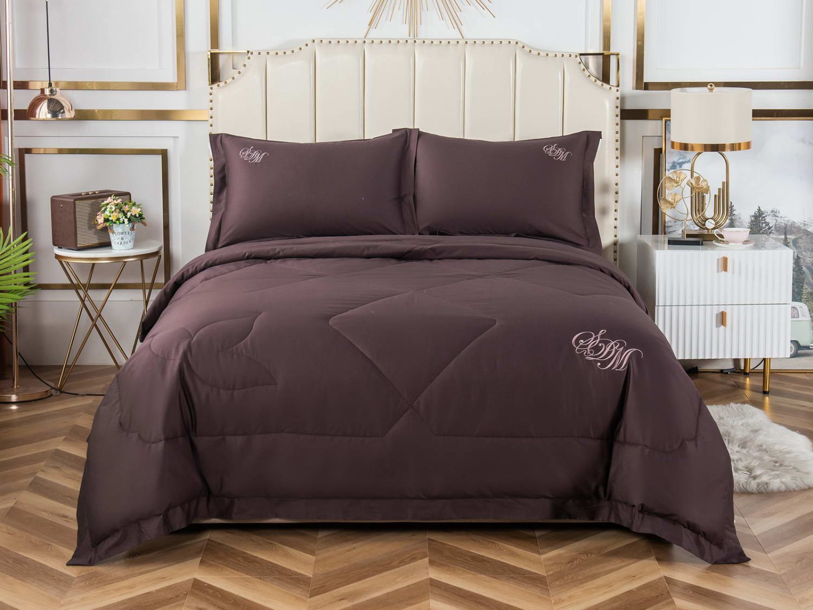 В комплект входят простыня, наволочки и одеяло. Одеяло простеганное, легкое и воздушное, его можно стирать в стиральной машине. Благодаря микроволокну в составе наполнителя для одеяла, оно всегда принимает свою начальную форму.