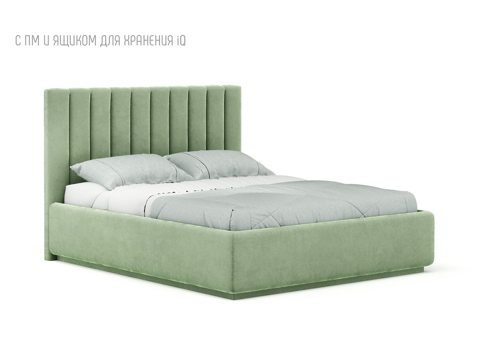 Кровать укомплектована IQ с подъемным механизмом и ящиком для белья без дна (дополнительная платная опция - дно к ящику IQ из HDF (ХДФ). Каркас кровати на цоколе, декоративный чехол на цоколе съёмный. Глубина ящика для белья - 30 см, без ограничения нагрузки на ящик.