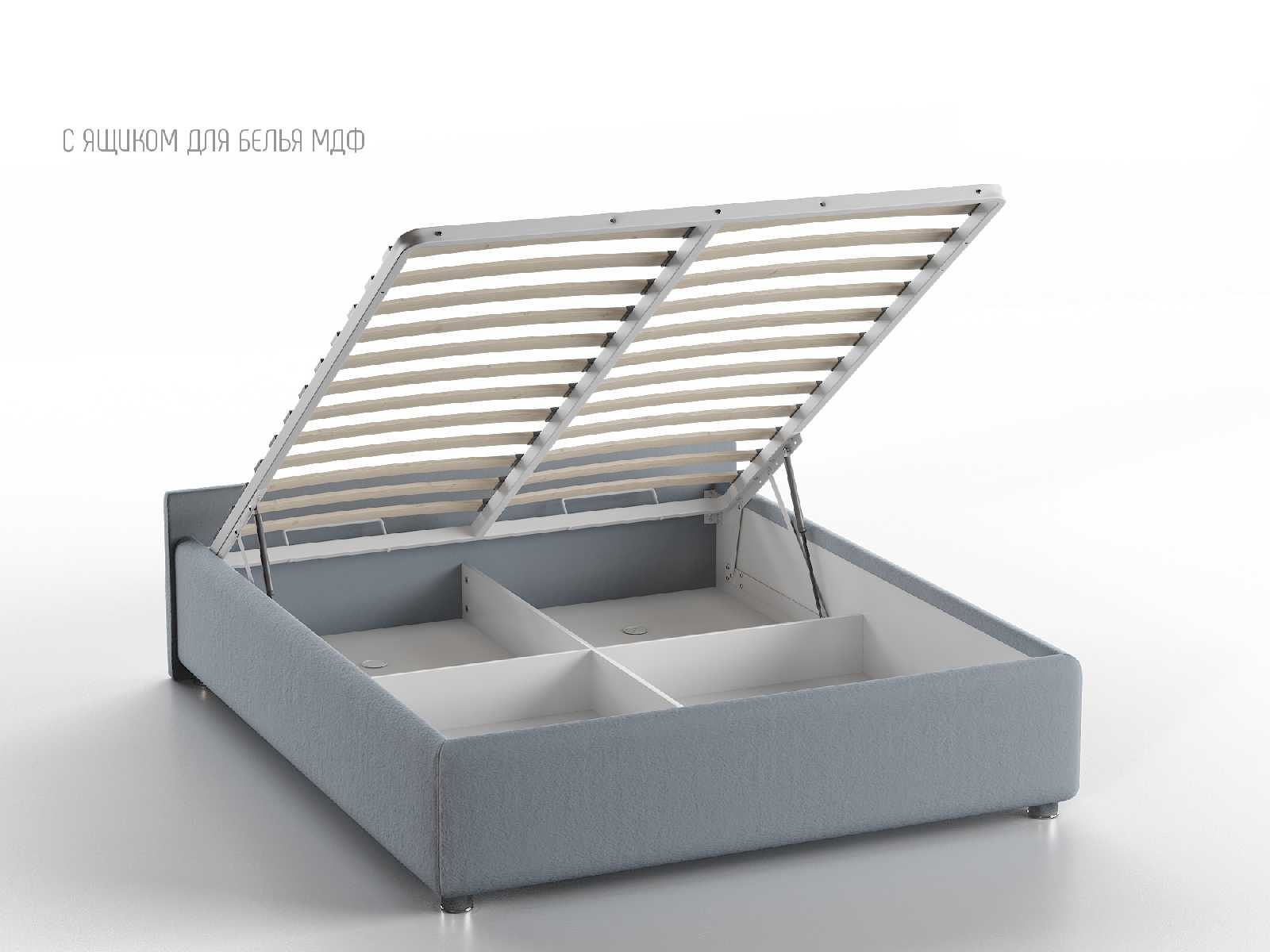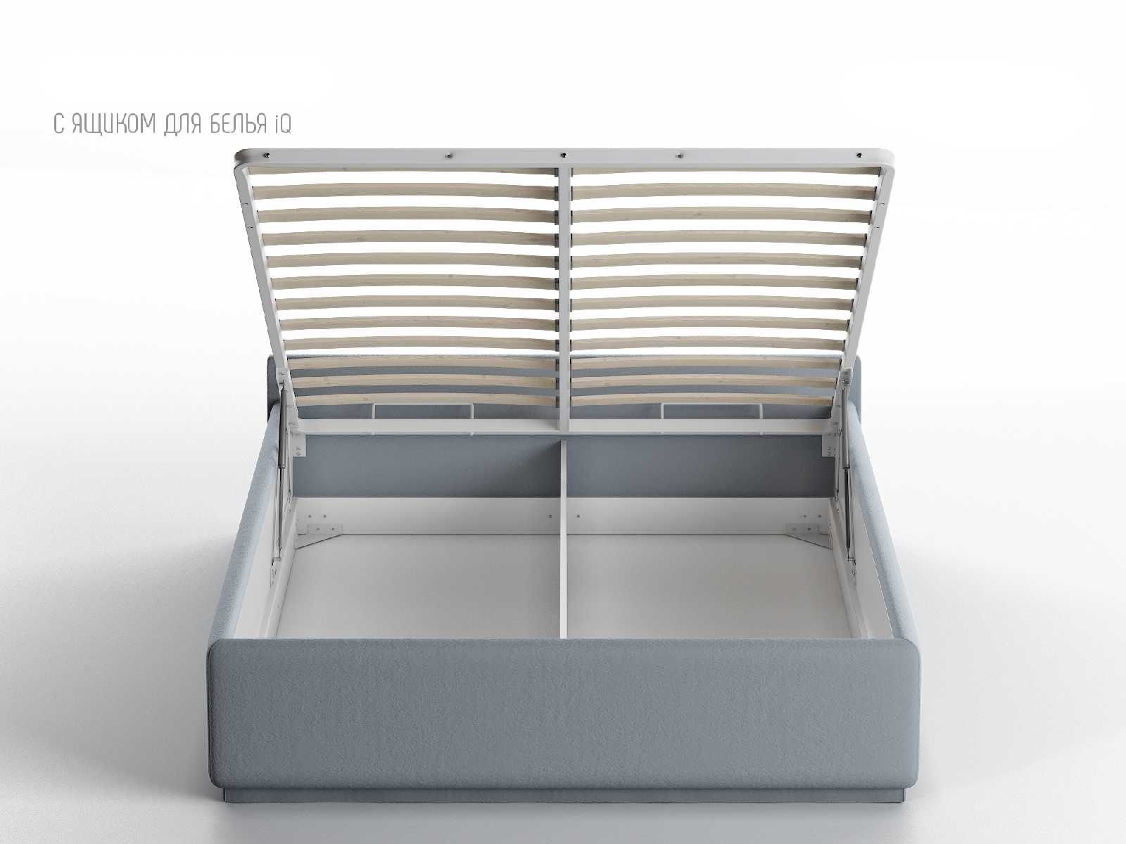 Кровать укомплектована IQ с подъемным механизмом и ящиком для белья без дна (дополнительная платная опция - дно к ящику IQ из HDF (ХДФ). Каркас кровати на цоколе, декоративный чехол на цоколе съёмный. Глубина ящика для белья - 30 см, без ограничения нагрузки на ящик.