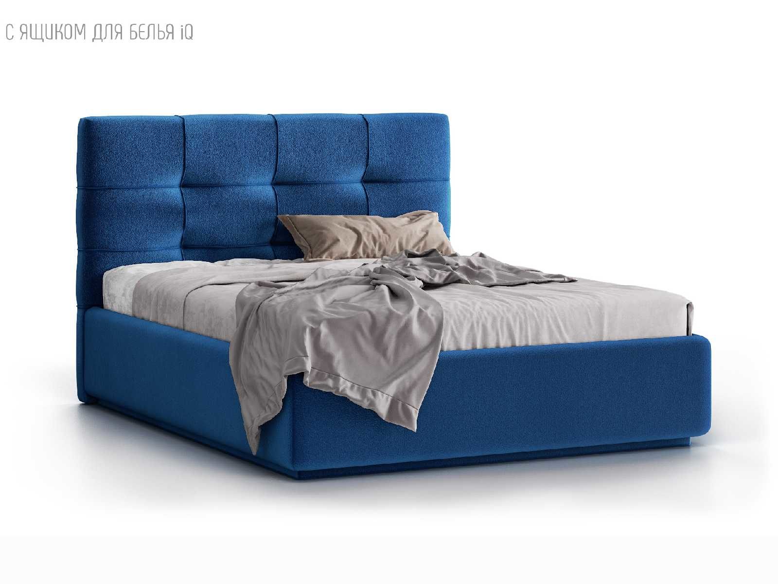 Кровать укомплектована IQ с подъемным механизмом и ящиком для белья без дна (дополнительная платная опция - дно к ящику IQ из HDF (ХДФ). Каркас кровати на цоколе, декоративный чехол на цоколе съёмный. Глубина ящика для белья - 30 см, без ограничения нагрузки на ящик.