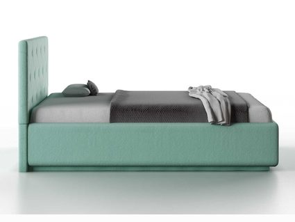 Кровать укомплектована IQ с подъемным механизмом и ящиком для белья без дна (дополнительная платная опция - дно к ящику IQ из HDF (ХДФ). Каркас кровати на цоколе, декоративный чехол на цоколе съёмный. Глубина ящика для белья - 30 см, без ограничения нагрузки на ящик.