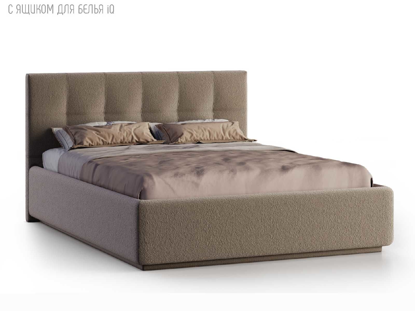 Кровать укомплектована IQ с подъемным механизмом и ящиком для белья без дна (дополнительная платная опция - дно к ящику IQ из HDF (ХДФ). Каркас кровати на цоколе, декоративный чехол на цоколе съёмный. Глубина ящика для белья - 30 см, без ограничения нагрузки на ящик.