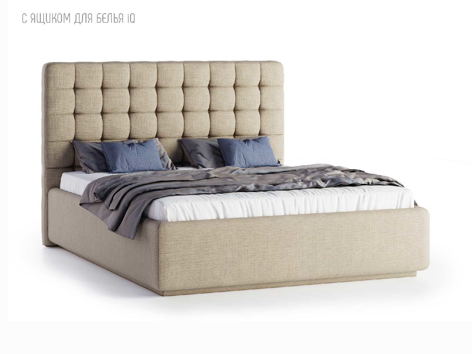 Кровать укомплектована IQ с подъемным механизмом и ящиком для белья без дна (дополнительная платная опция - дно к ящику IQ из HDF (ХДФ). Каркас кровати на цоколе, декоративный чехол на цоколе съёмный. Глубина ящика для белья - 30 см, без ограничения нагрузки на ящик.