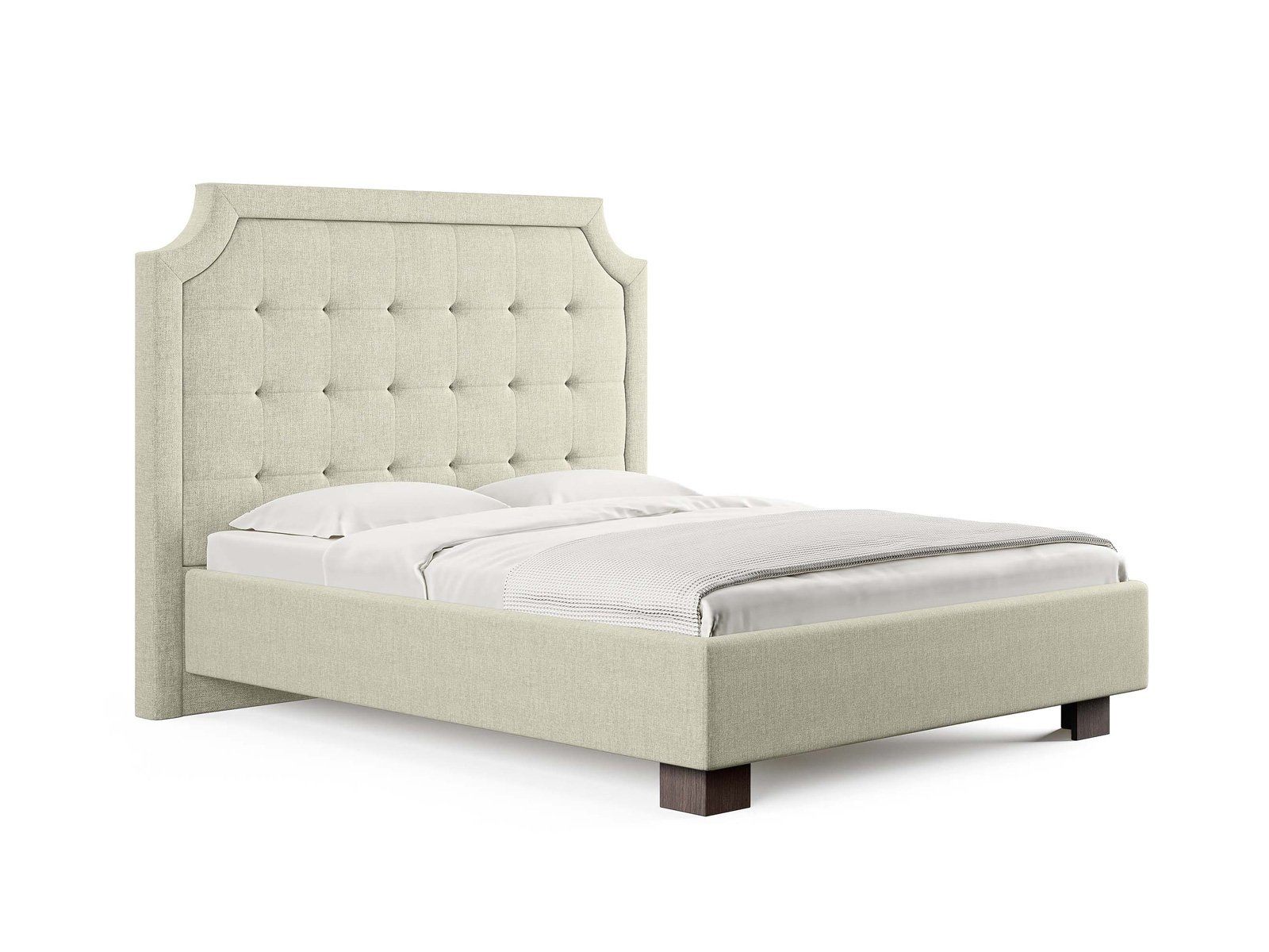 Кровать прекрасно впишется в интерьер от классики до современного стиля и cтанет отличным решением для просторной светлой спальни. Высокая спинка с мягкими утяжками и массивной рамкой выглядит эффектно. Задняя часть спинки кровати выполнена в основной ткани, благодаря этому ее можно установить в центре комнаты. Увеличенная прочность кровати достигается за счет металлического каркаса по периметру. Массивные ножки, выполнены из бука цвета венге. Расстояние от пола до царг способствует легкой уборке под кроватью, в том числе роботом – пылесосом. При желании возможно установить подъемный механизм с бельевым коробом либо трансформируемое основание Aquarius.