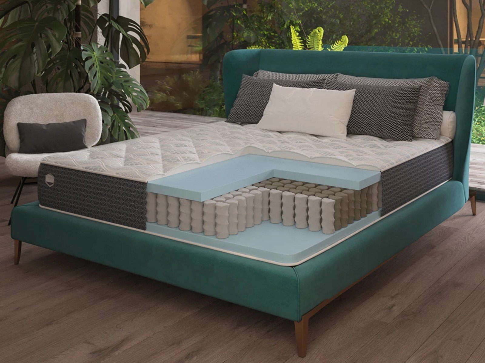В основе - материалы последнего поколения без свинца и формальдегидов: базовый слой - независимые пружины минипакет (688 пружин на 1 спальное место) высотой 14 см. и мягкий инновационный дышащий материал с каждой стороны.