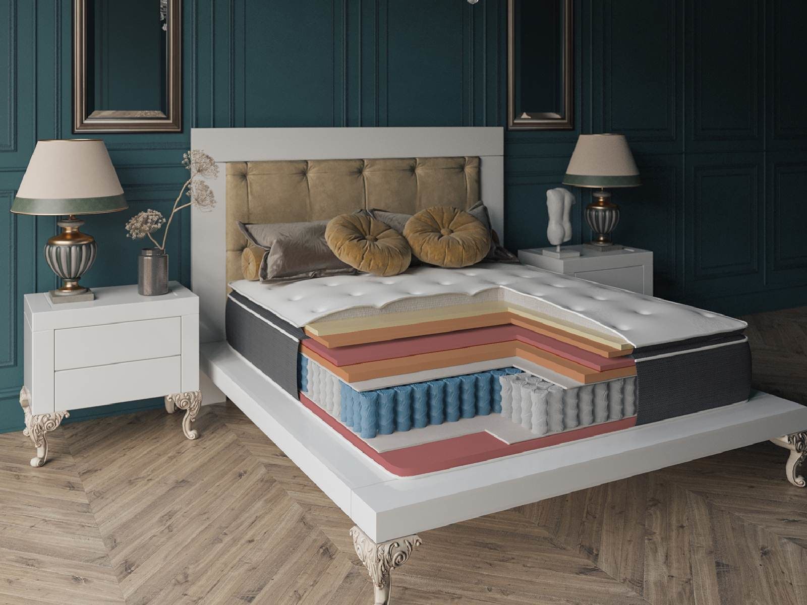 1. высокий матрас с большим количеством ценных слоев, отделяющих спину от пружин;