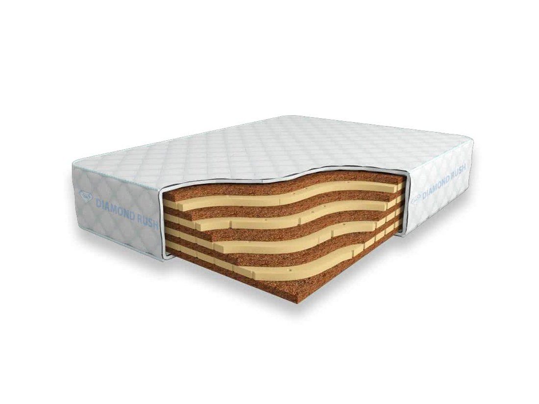 Матрас Diamond Rush Super Mix Cocos 27 DR является беспружинным, т.е. не имеет в своей основе пружинного блока. В его состав входят одно или несколько чередований слоев латексированной кокосовой койры и натурального латекса с перфорацией. Все слои по 3 см. Такая модель матраса относится к среднежестким и обладает ортопедическим эффектом.