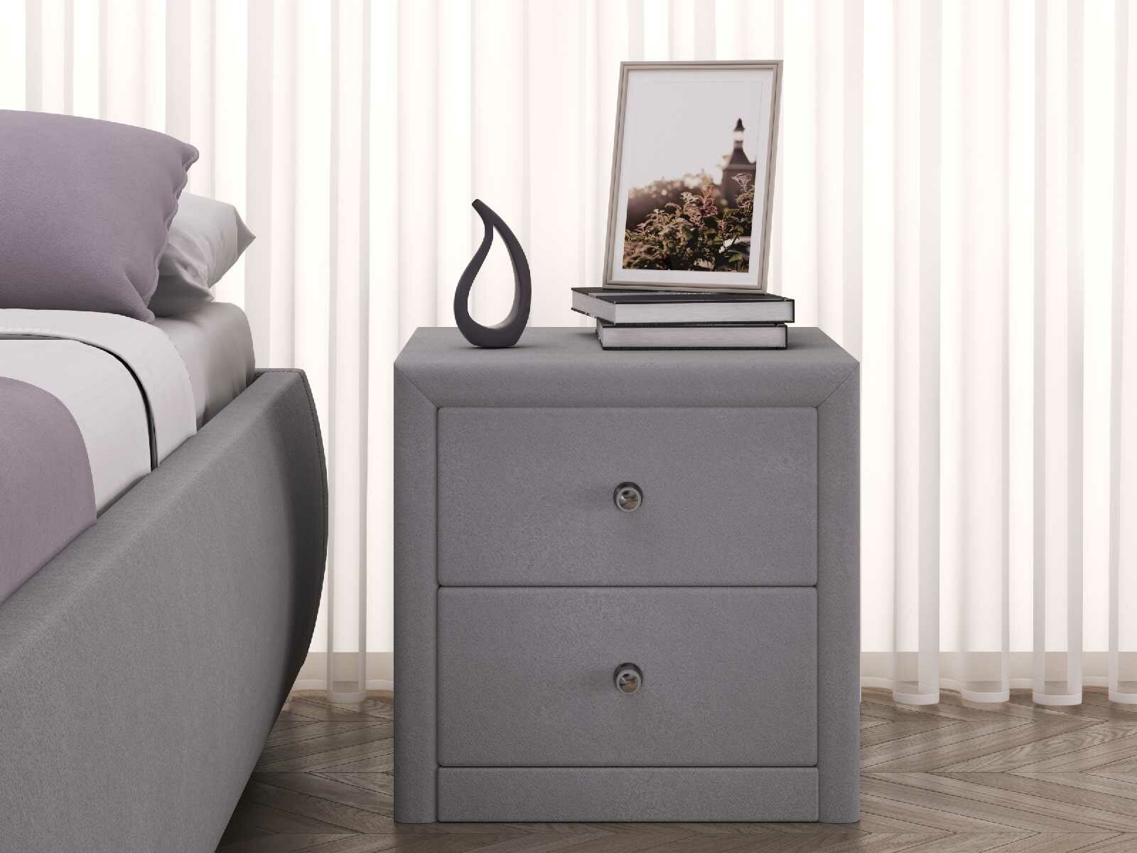 Прикроватная тумба «Мирано» самим своим видом создает атмосферу умиротворения, столь уместную в спальне. Прямые очертания модели подчеркнуты обивкой из качественной ткани. На ровной поверхности тумбы можно расположить будильник, ночник, стакан с водой. В двух выдвижных ящиках хватит места для ночной косметики, маски для сна, гаджетов, нескольких книг для вечернего чтения.