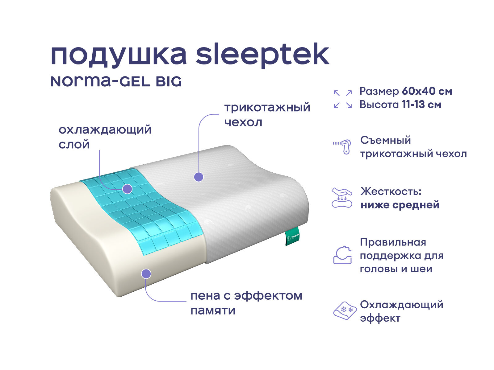 Модель анатомической формы, которая подарит оптимальную поддержку головы и шеи во время сна. Наполнителем служит эластичная пена мемори, обладающая эффектом запоминания формы. Мемори помогает снять накопившееся за день напряжение, а также исключает эффект обратного давления. На поверхности подушки размещен охлаждающий гель, распределяющий давление максимально равномерно. Гель приятно охлаждает, что позитивно влияет на качество сна и обмен веществ. Подушка способствует улучшению кровообращения и снятию отеков.