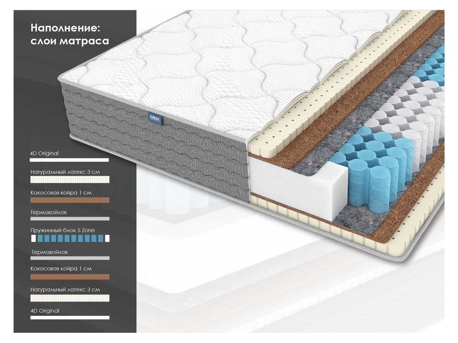 Димакс ОК Медиум – это ортопедический матрас средней жёсткости, с полностью натуральными наполнителями. Модель сочетает в себе эластичность латекса и устойчивую поддержку койры, а 5-зональный блок независимых пружин усиливает эти свойства, создавая идеальный баланс комфорта и ортопедического эффекта.
