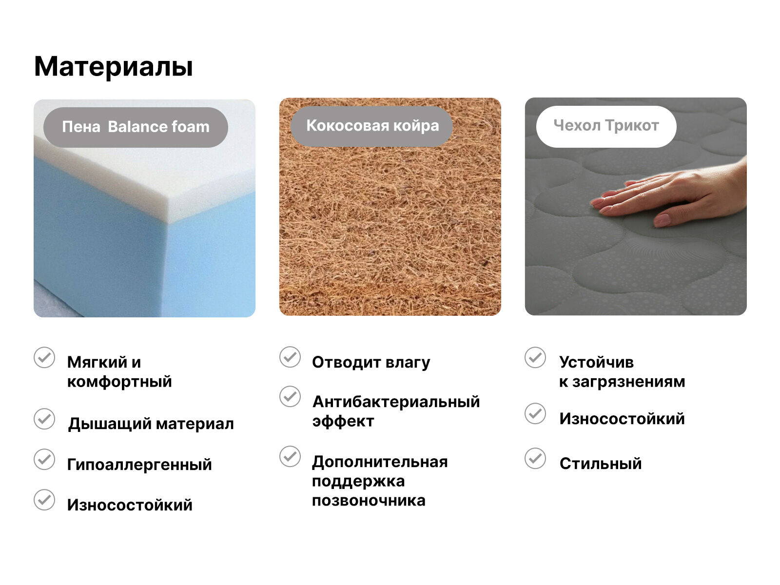 Balance foam оптимально сочетает в себе плотность и жёсткость. Благодаря этому наполнитель даёт надёжную и правильную поддержку для спины и позвоночника.