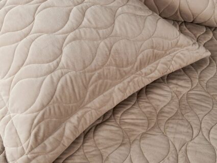 Покрывала и наволочки изготовлены из велюра высокой плотности - приятной на ощупь бархатистой ткани с коротким ворсом. Пошив покрывала с кантом, наволочки с ушками 5 см.