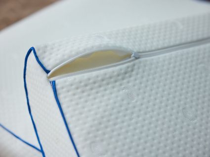 Для пошива чехла используется мягкий и приятный к телу трикотаж. Боковые части модели оформлены стильным синим кантом.