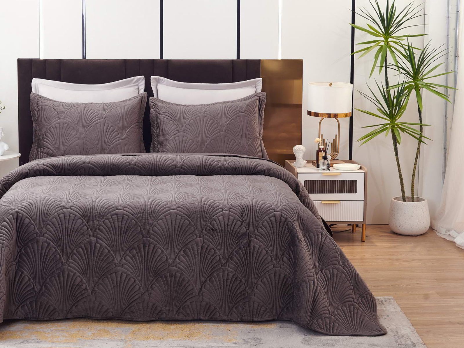 Роскошное велюровое покрывало Ариэль станет изюминкой любого интерьера, ведь оно потрясающе выглядит и приятное на ощупь. Обратите внимание на стежку покрывала – она выполнена в виде ракушек с эффектом 3D. Из-за особого плетения, велюровая ткань покрывала отражает свет и красиво переливается при различном освещении.