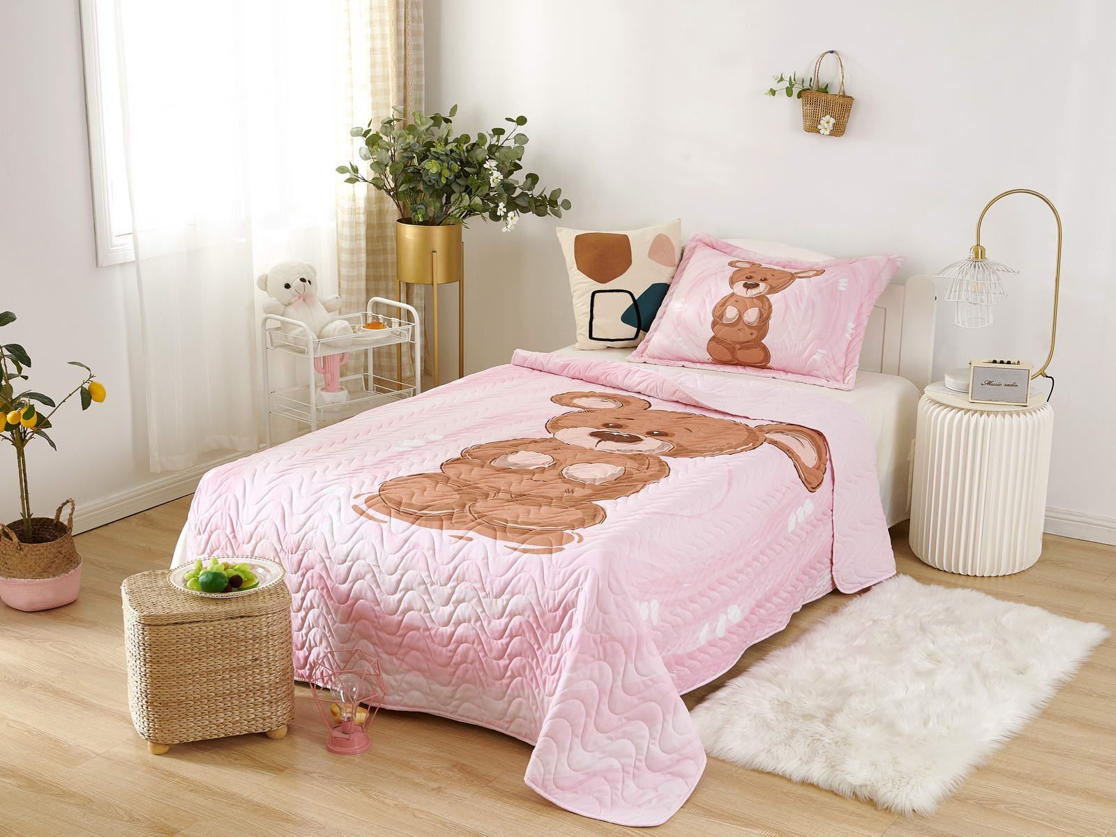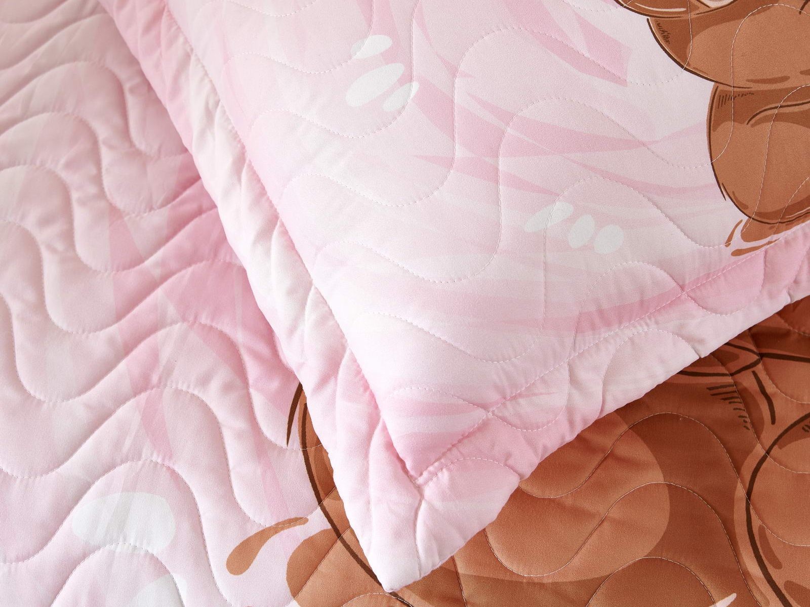Детские покрывала - это особая забота об уюте и комфорте ребенка. Красивое, стеганое покрывало коллекции «Sunny day» придаст любой детской спальне яркую индивидуальность. Волнистые стежки делают изящные покрывала еще более выразительными и изящными. К ним в комплекте идут наволочки, у них есть интересная особенность, которая непременно понравится ребенку– небольшие ушки.