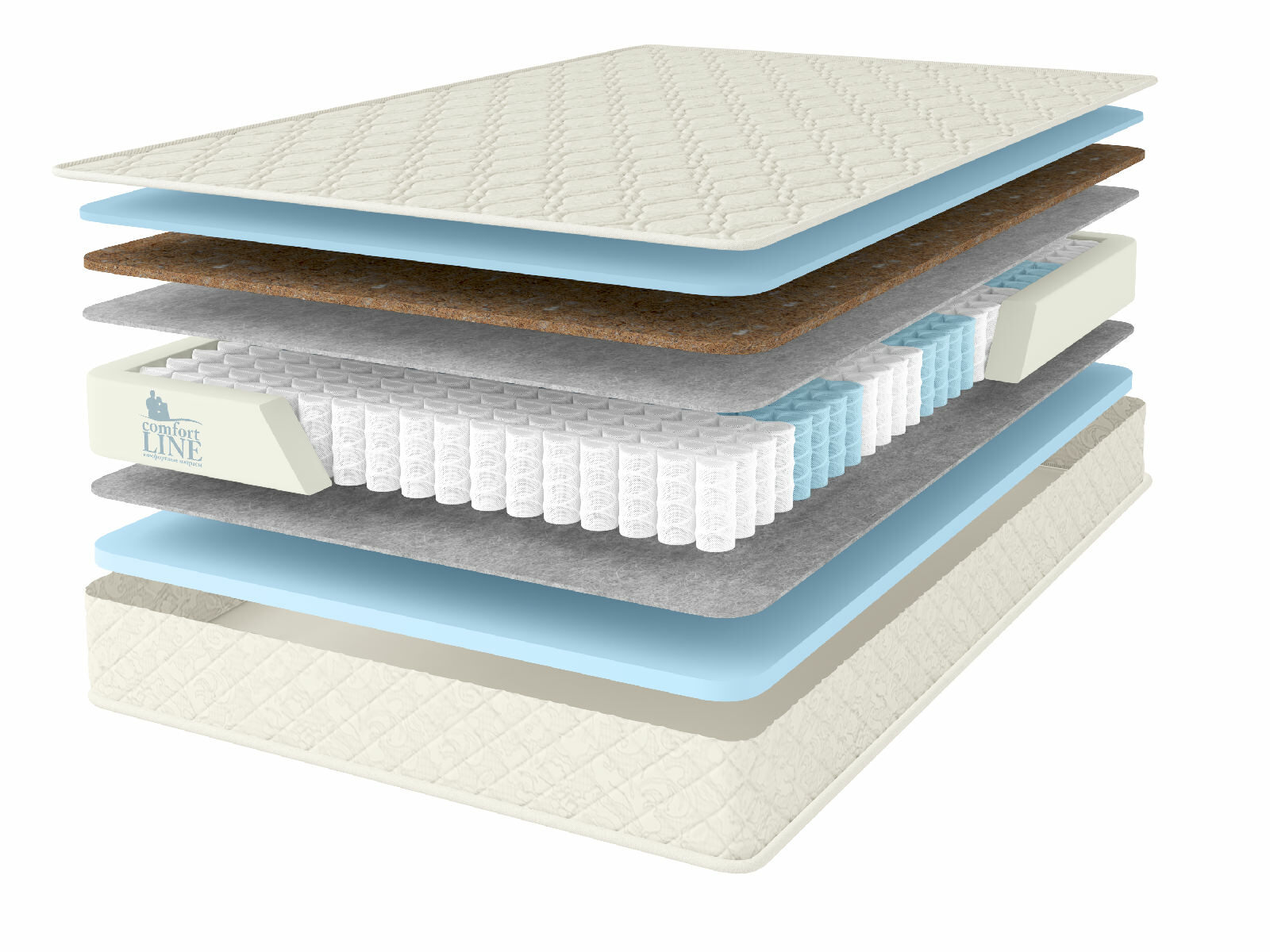 У матраса укреплён периметр. Плотная пена установлена по краям изделия для того, чтобы пружины не проседали и не проваливались. Дополнительно блок проложен термополотном для изоляции слоев наполнителя. Благодаря такому расположению пружины не оказывают механического воздействия на внутренние слои материалов.