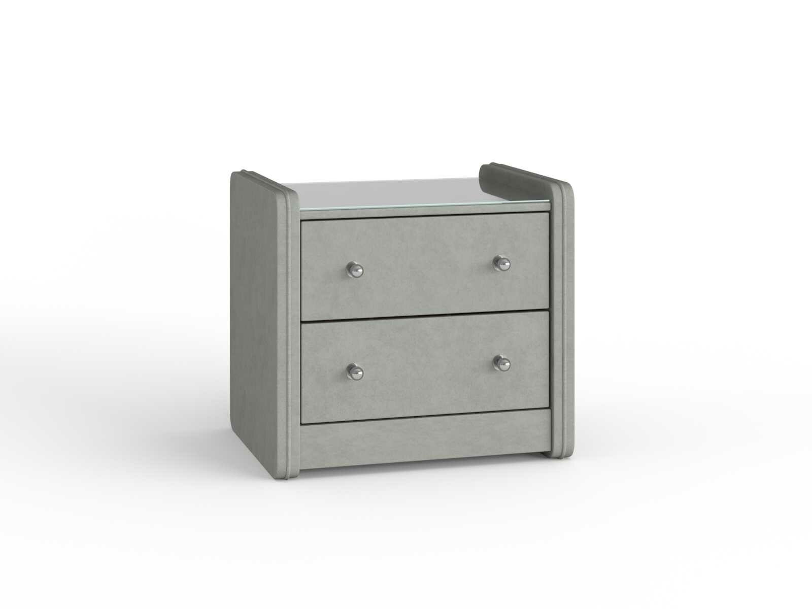 Тумба прикроватная Сандрига выполнена в изысканном классическом стиле. Обивка из высококачественного материала придает мебели особый шарм. Модель легко впишется в современные интерьеры и станет практичным дополнением меблировки спальни. На стеклянной столешнице расположится ночник, книга или чашка чая, а для необходимых под рукой мелочей предусмотрены два выдвижных ящика с ручками.